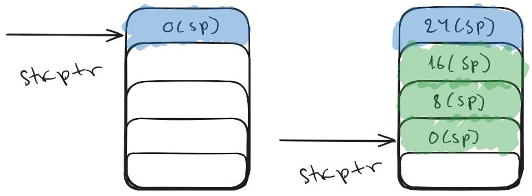 Similar to that if we want to store 3 variables (dw), then we subtract 24 bytes and then store the variables in addresses: 16(sp), 8(sp), 0(sp).
