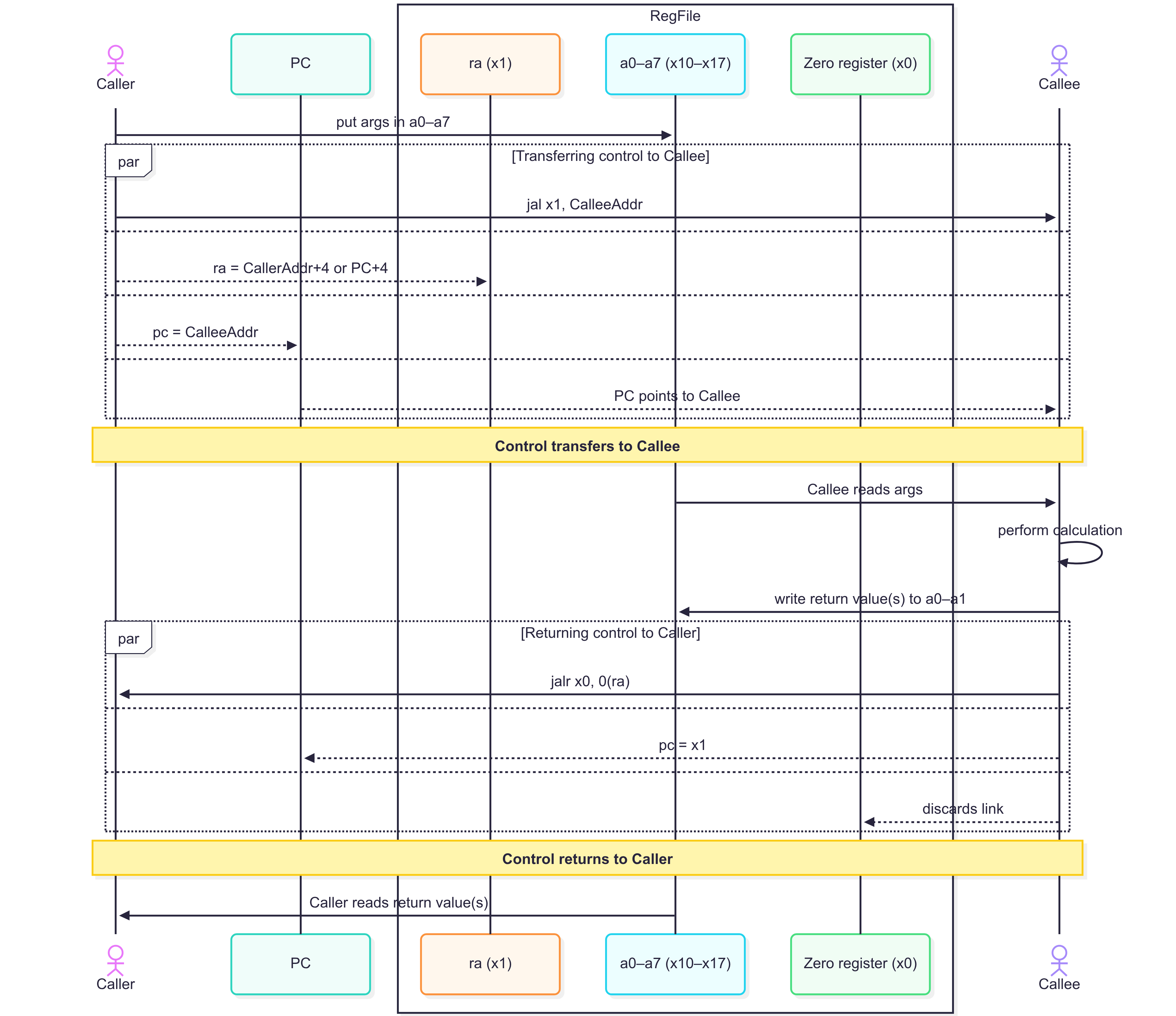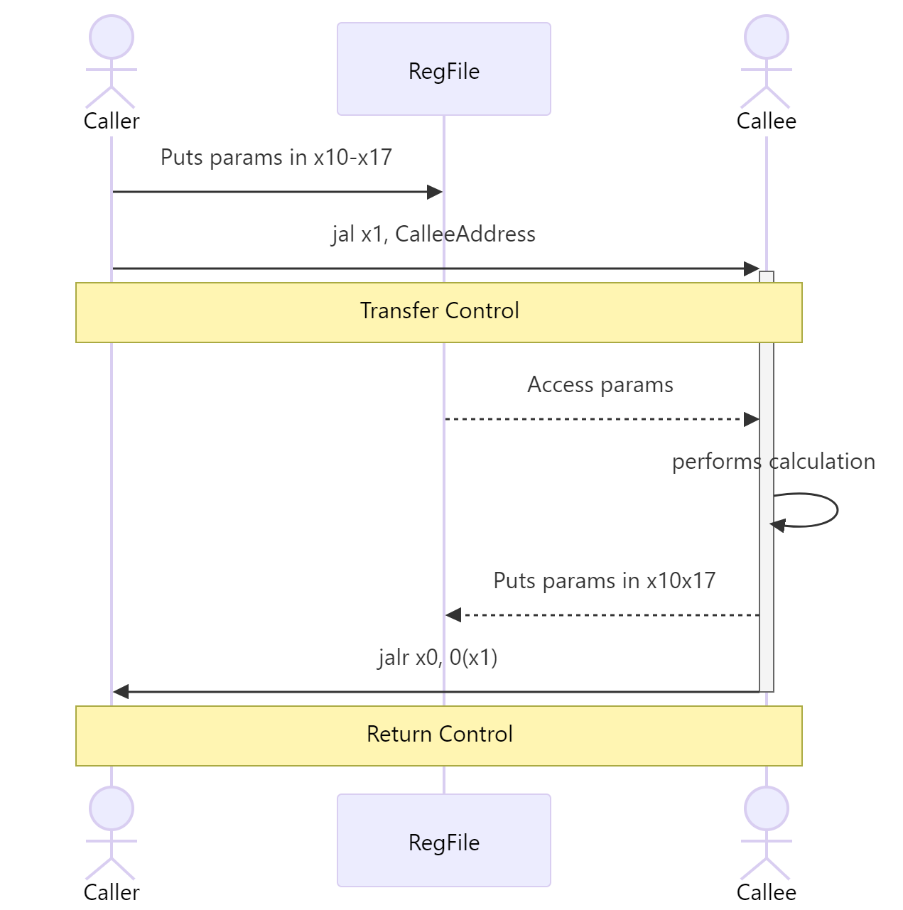 With the addition of PC, the sequence diagram would look a bit more complicated. But it is essentially doing the same thing. Main difference is that now we have partitioned our register file to specific registers (x1 for return address/ra or program counter/pc). This demystifies our register file a bit. And having the concept of program counter is very essential to computing, and would help understanding the program flow in more complex procedure calls (like recursive functions).