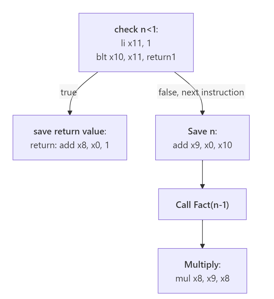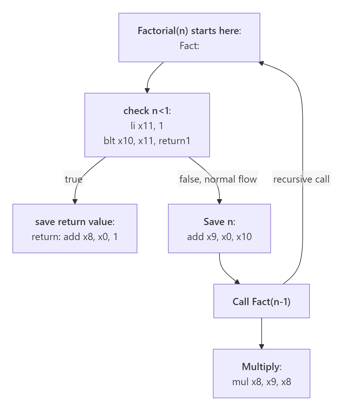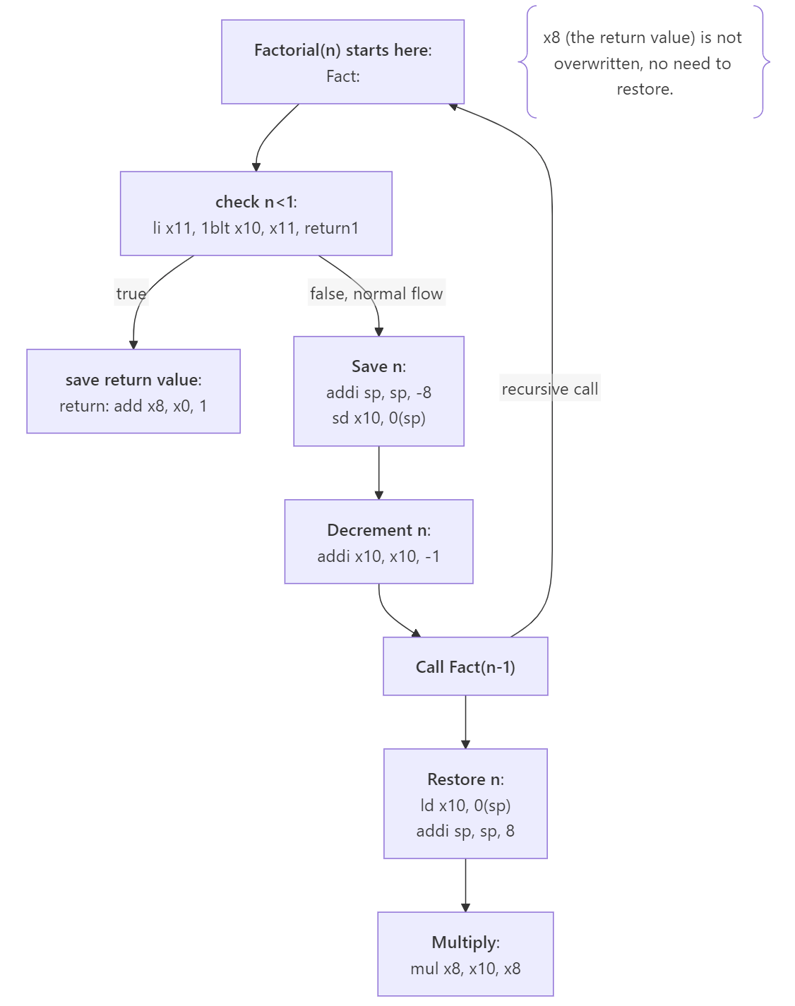 jalr x0, 0(x1)But for the other case, we have to first push to stack before calling Fact(n-1) and restore after multiply.