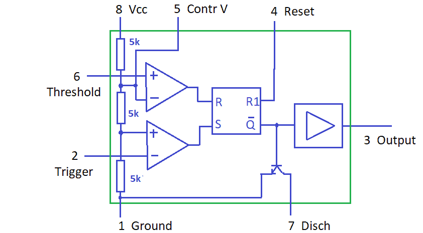Two Comparators: They compare the voltages (Threshold voltage at pin 6 and Trigger Voltage at pin 2) and set/reset the output.